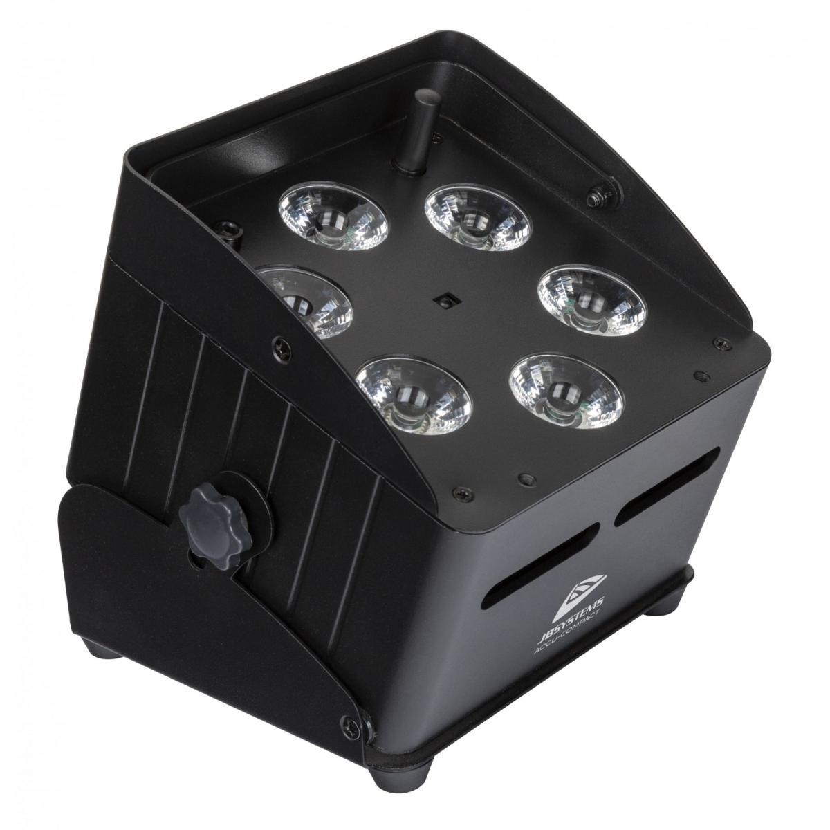 Der ACCU-COMPACT von JB Systems ist ein Akkubetriebener LED-Projektor, bestückt mit 6 Stück 10 Watt RGBWA LEDs und einem Abstrahlwinkel von 25 in einem eleganten schwarzen Gehäuse.