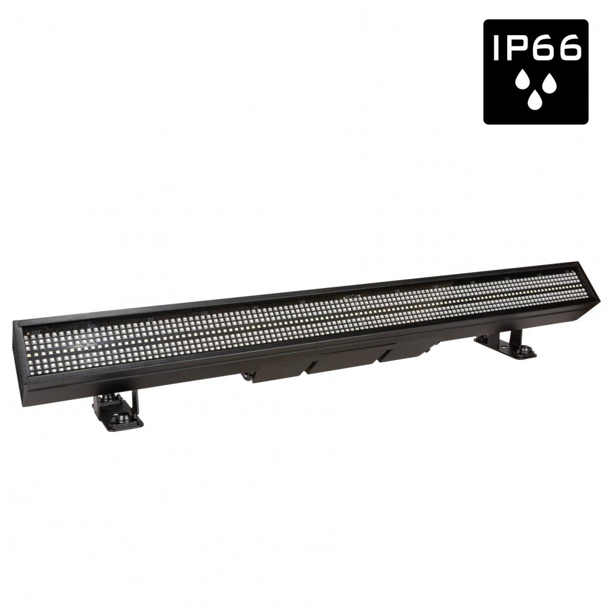 Der BTI-LIGHTSTRIKE IP66 von Briteq ist eine extrem leistungsstarke und vielseitig einsetzbare OUTDOOR LED-Pixel-Effekt-Bar mit 112 superhellen CW-LEDs (16 Zonen) und 672 RGB-LEDs (32 Zonen).