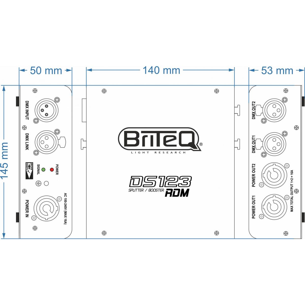 Der DS123-RDM von Briteq ist ein sehr kompakter und robuster RDM-kompatibler DMX-Splitter. Der Splitter verteilt den Netzstrom (PowerCON) und den DMX-Eingang (3pin-XLR) auf 2 optisch getrennte Ausgänge.