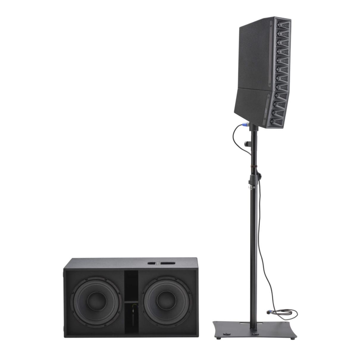 Optionaler Adapter für die MOJO Signature, um den Subwoofer mit dem Topteil per Kabel zu verbinden – ohne das Verbindungsrohr. Diese Konfiguration erlaubt es, den Subwoofer horizontal auf dem Boden/Bühne zu platzieren und das Topteil auf einem Lautsprecherstativ.
