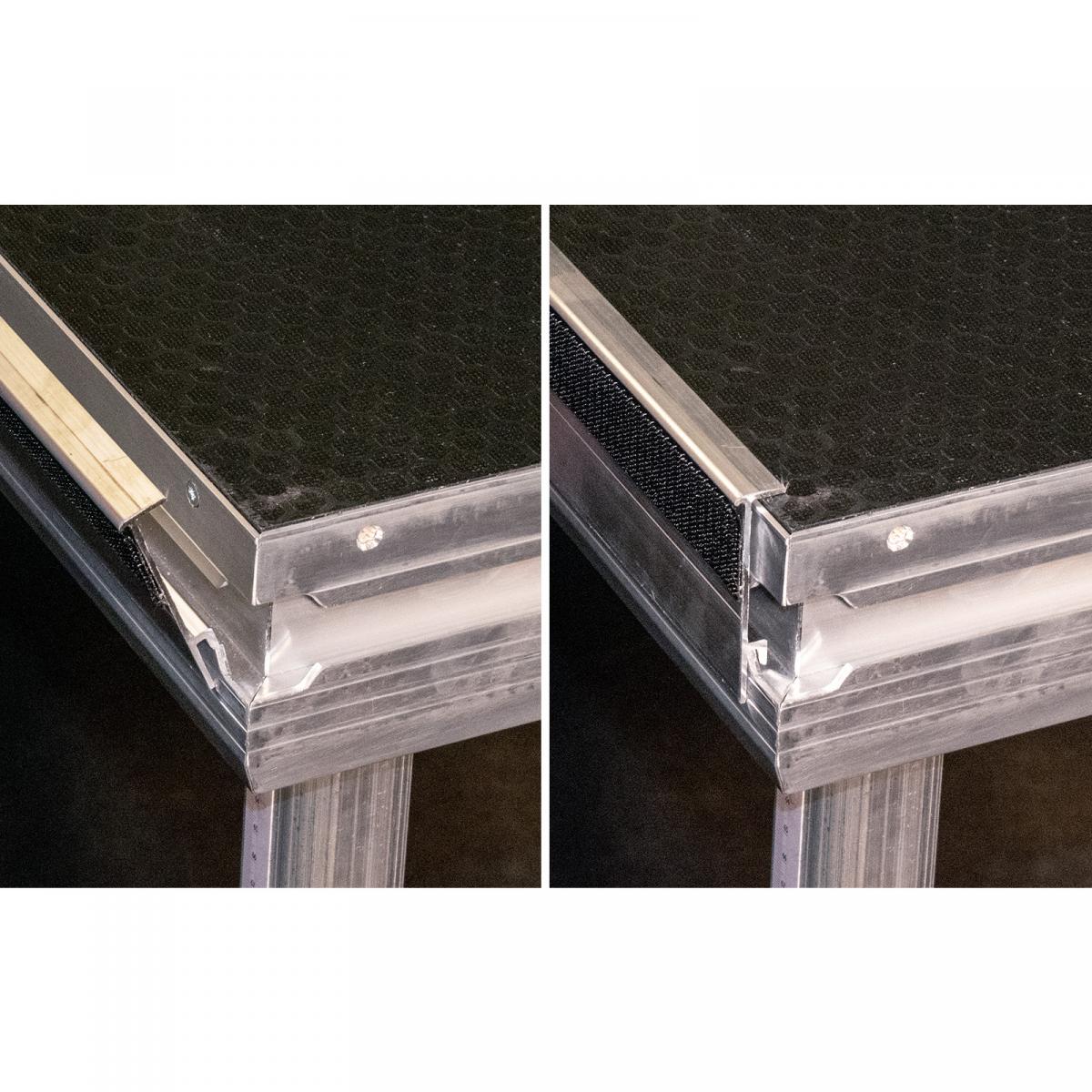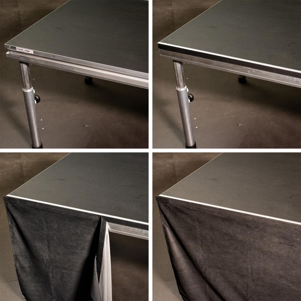 Befestigungsprofil (Klicksystem) für Bühnenskirting (Molton mit Klettverbindung). Die Montage erfolgt ohne Werkzeug an unseren Bühnenelementen.
